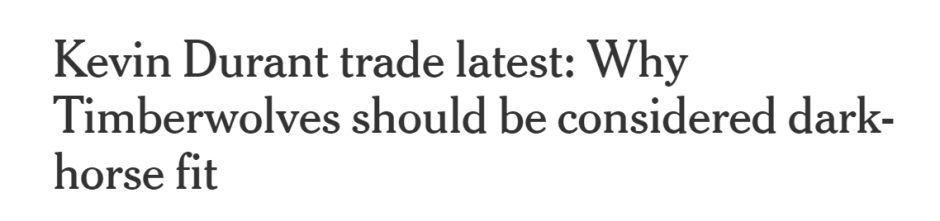 2月时,森林狼队与太阳队谈判的前提是,他们认为杜兰特对加盟森林狼持开放态度。他和爱德华兹彼此之间有深厚的感情。杜兰特和森林狼队篮球运营总裁蒂姆-康纳利都在华盛顿特区地区有深厚的背景,且彼此非常熟悉。杜兰特与麦克丹尼尔斯的潜在搭配——麦克丹尼尔斯的外线防守是联盟顶级水准——将使他能够在进攻端大放异彩,同时承担比在太阳队时更轻松的防守任务。